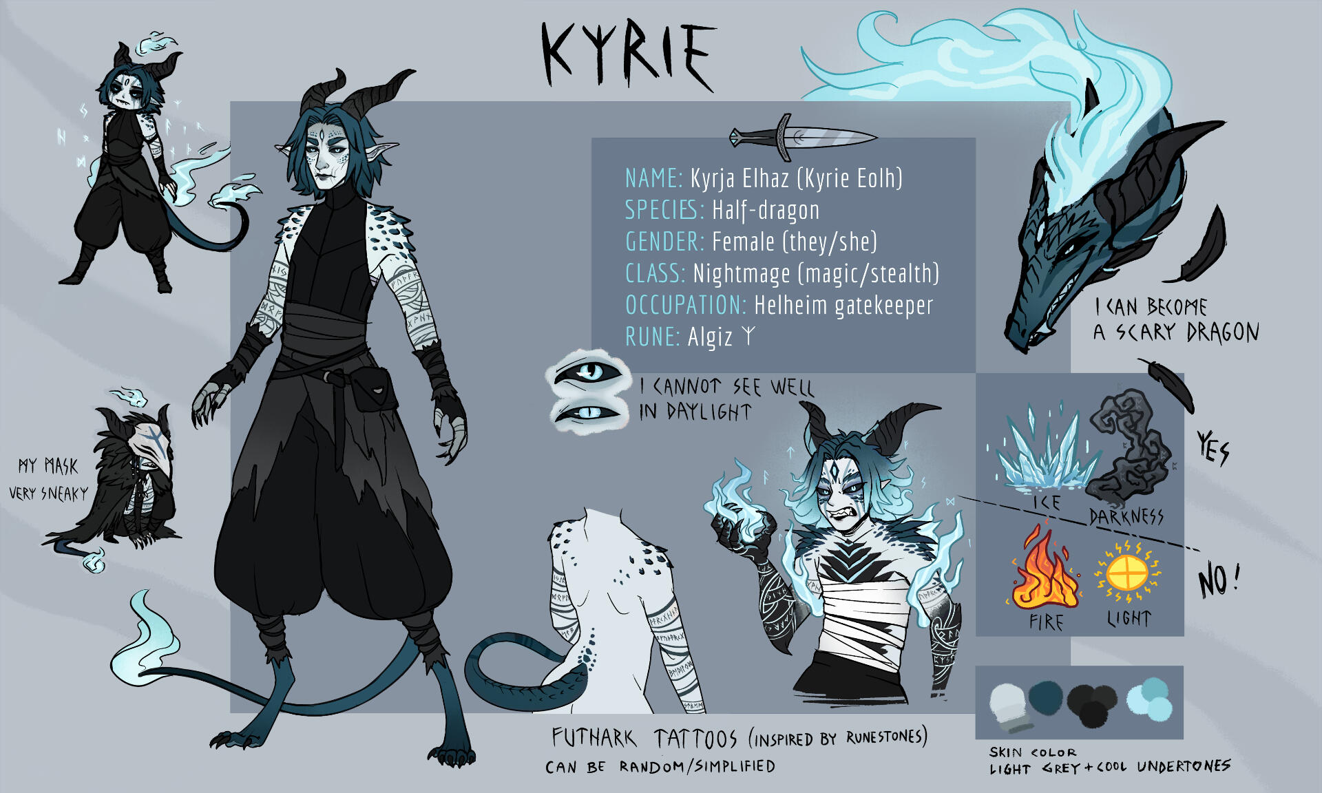 can be drawn with or without facepaintdigitigrade dragon legs are preferredscales/tattoos can be placed randomlyflame above head appears when using magic (I tend to forget about this, oops)you can draw them in any outfit/facepaint depicted OR you can design your own (masculine viking, dark fantasy clothes, bone/silver accessories, elder futhark runes...)